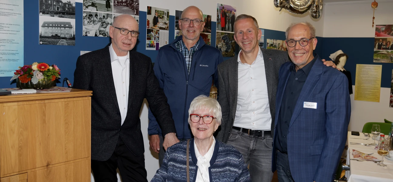 Drei Generationen Einrichtungsleitung und zwei Generationen Pflege-Geschäftsführung treffen beim Jubiläum zusammen: Diakonisse Heide Buschinski (Einrichtungsleitung 1987 bis 2001) sowie (v.l.) Reinhard Quellmann (Geschäftsführer Diakonie Ruhr Pflege bis 2019), Dirk Schulze-Steinen (Einrichtungsleitung 2001 bis 2005), Jens Fritsch (Geschäftsführer Diakonie Ruhr Pflege seit 2019) und Andreas Vincke (Einrichtungsleitung seit 2005).
