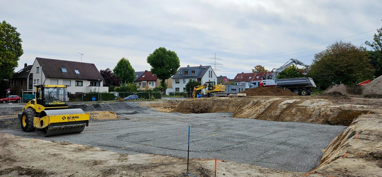 Die Erdarbeiten für die Errichtung von zwei neuen Wohneinrichtungen für Menschen mit Behinderung der Diakonie Ruhr laufen – wie hier an der Lewackerstraße in Linden.