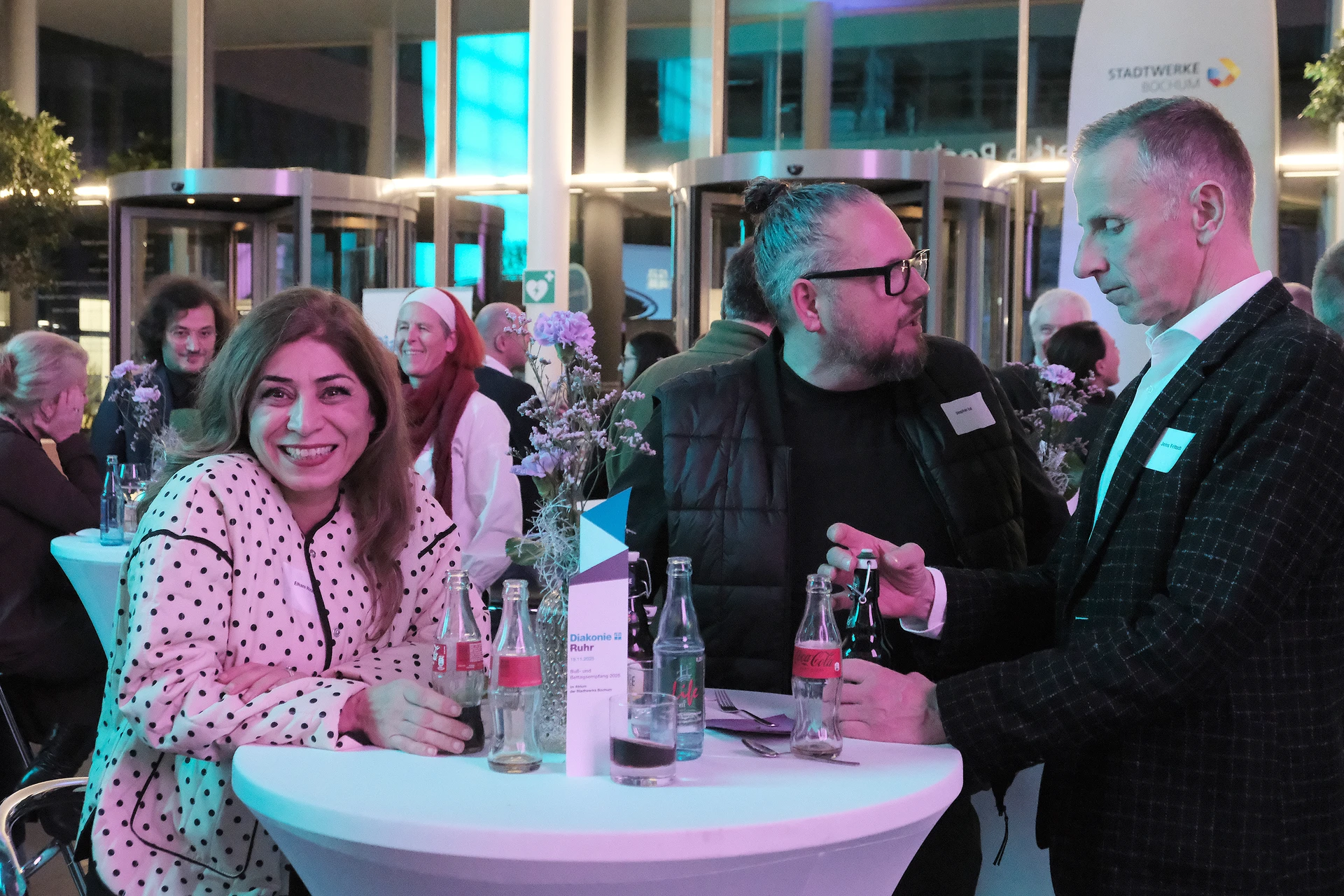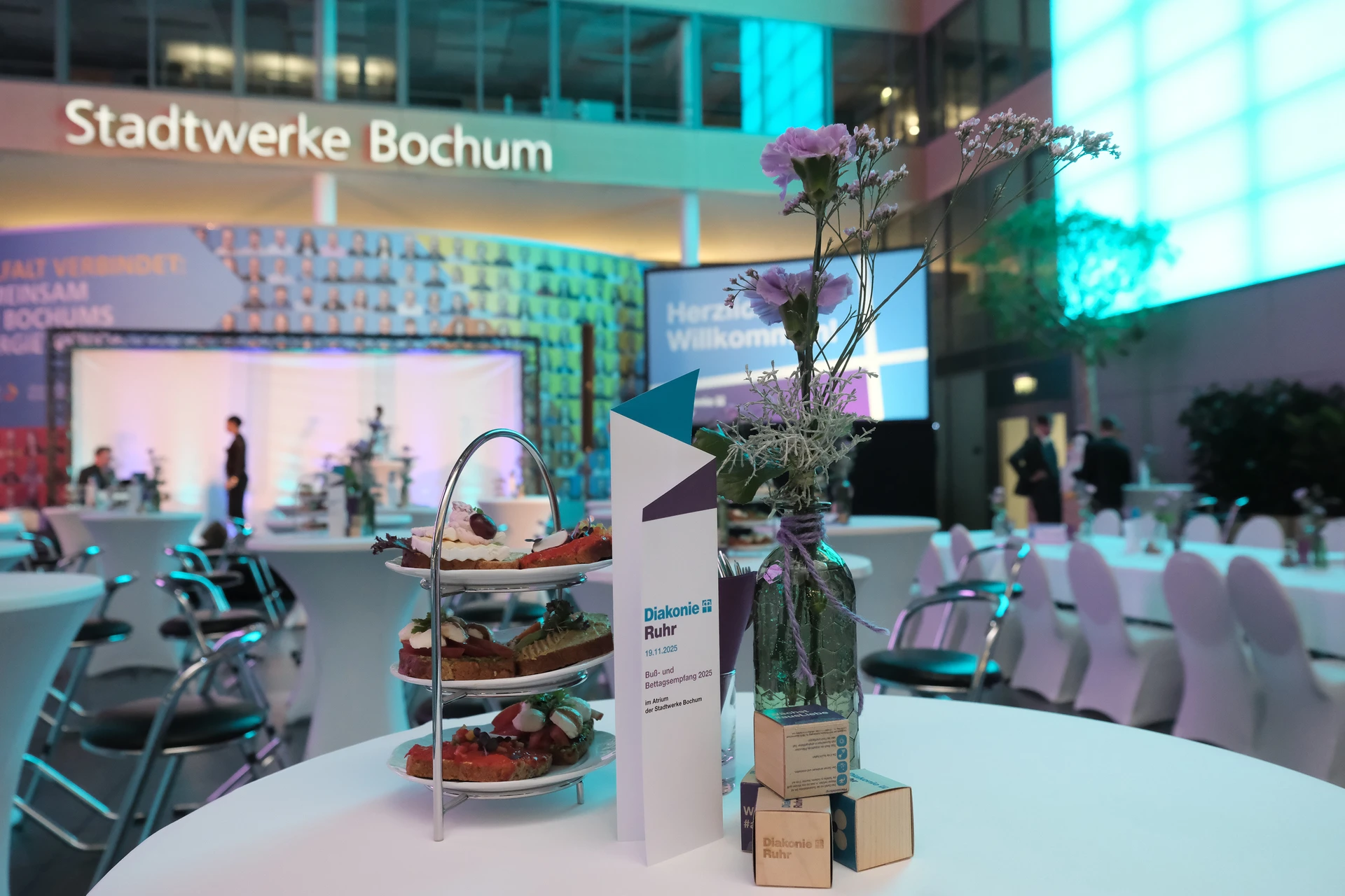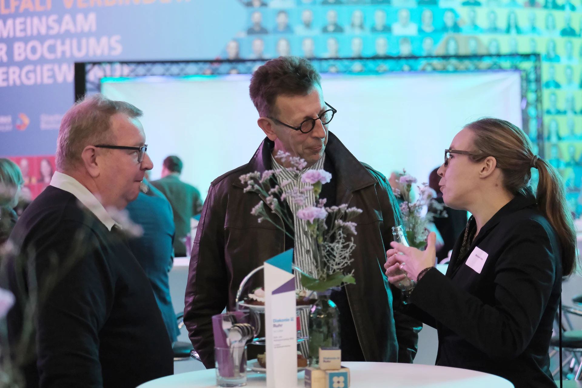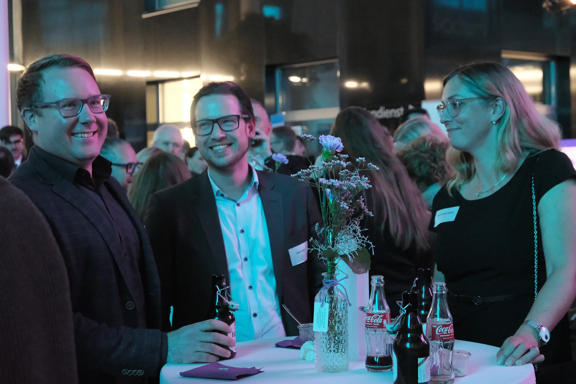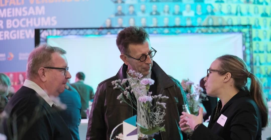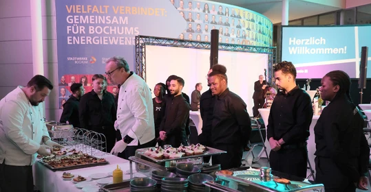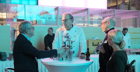 Neben dem Programm auf der Bühne standen Begegnung, Vernetzung und Austausch im Zentrum des agilen Stehempfangs mit mobilem Büfett statt festlich eingedeckter Tische. Die Gäste nutzten fleißig die Gelegenheit zu anregenden Gesprächen. Bei der Schätzfrage, bei der alle Anwesenden tippen konnten, wie viel Kilo Kaffee 2024 über die Catering-Tochter Culina Ruhr bestellt wurden, war Christian Gast mit 7650 Kilo am nächsten dran. 7537 Kilo wäre die richtige Antwort gewesen. Dafür liefert ihm die Floristikabteilung der Werkstatt Constantin-Bewatt ein halbes Jahr lang jede Woche einen Blumenstrauß nach Hause. Mit dem Gewinn will Christian Gast seinen künftigen Ehemann beglücken.