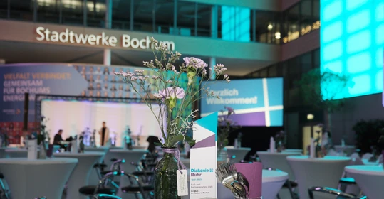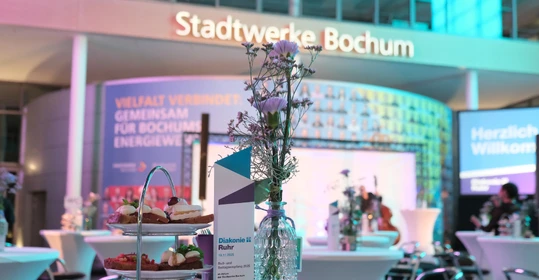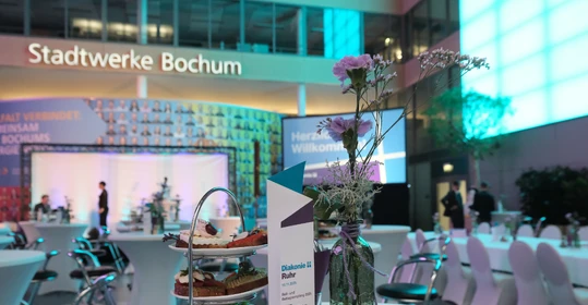 „Die Zeit der Appelle ist vorbei“, betonte Diakoniepfarrer Sven Pernak im geistlichen Impuls. „Lassen Sie uns gemeinsam die Zeit und die Kraft nutzen, um alles dafür zu tun und zu kämpfen, damit Freiheit und Menschenwürde eben keine leeren Formeln sind, sondern Realität.“ Wie bereits gewohnt erhielten zahlreiche Gäste aus Diakonie, Kirche und Gesellschaft beim Buß- und Bettagsempfang der Diakonie Ruhr im Atrium der Stadtwerke Bochum statt warmer Worte spannende Einblicke in die Arbeit der Diakonie-Ruhr-Familie. Dabei standen diesmal die Themen Ehrenamt, Nachhaltigkeit und Digitalisierung im Mittelpunkt.