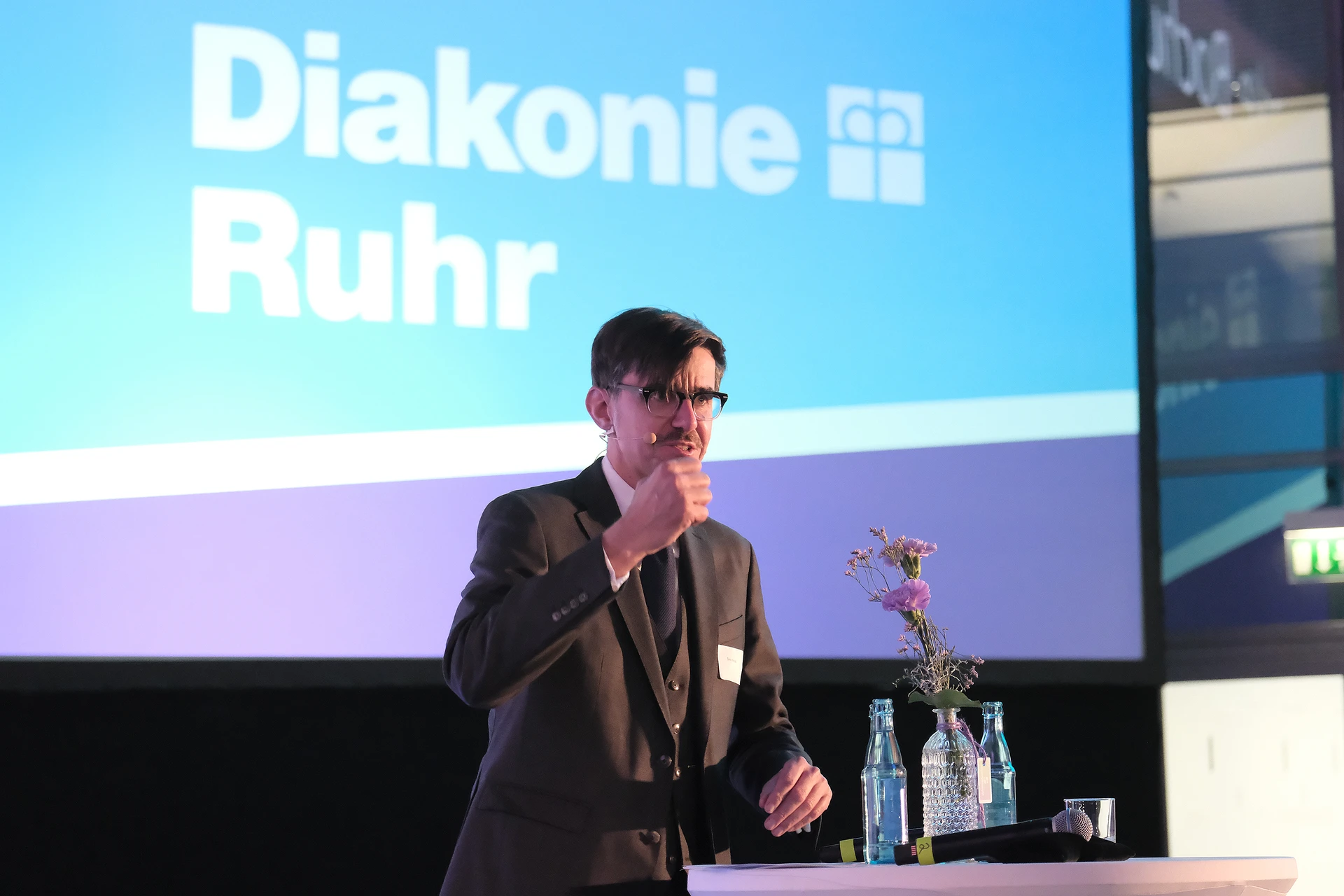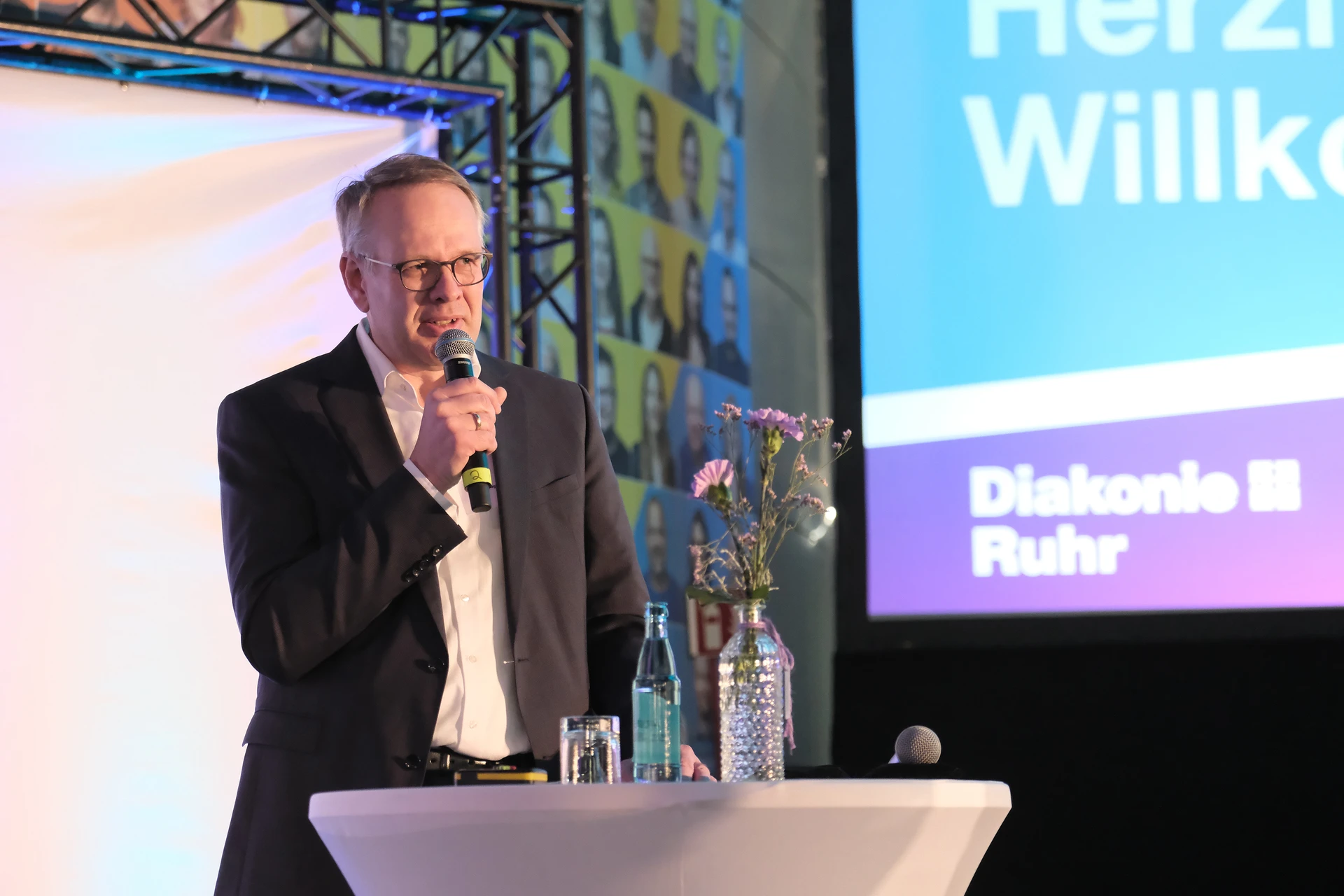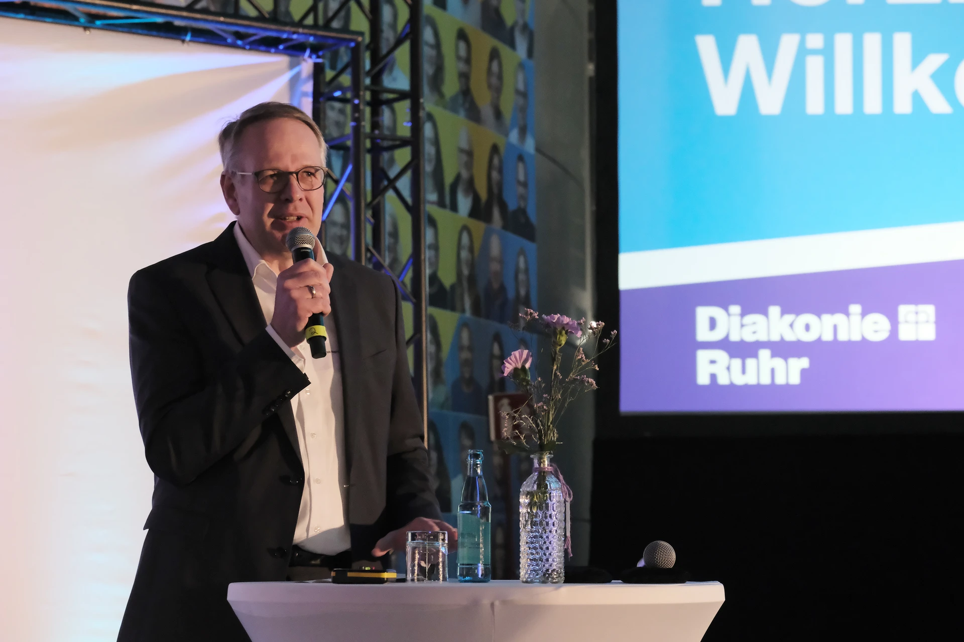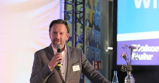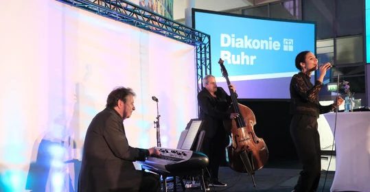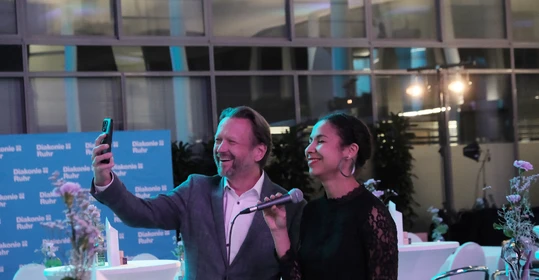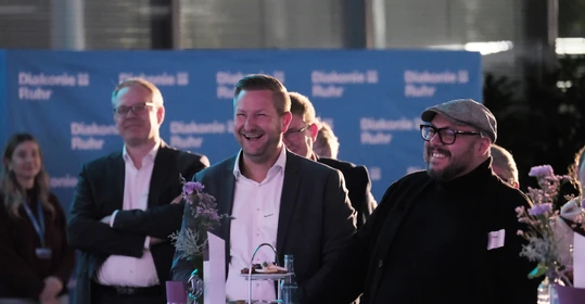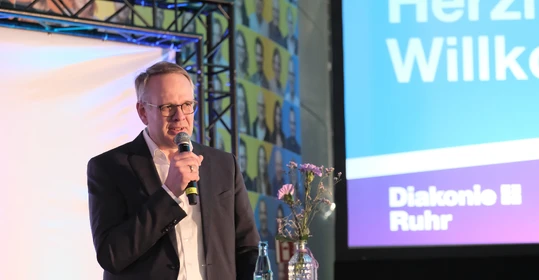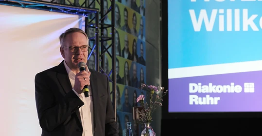 Auch über die vorgestellten Themen hinaus ist seit dem letzten Buß- und Bettagsempfang viel passiert in der Diakonie-Ruhr-Familie. Geschäftsführer Jens Koch, der als Showmaster durch den Abend führte, zählte exemplarisch Einrichtungseröffnungen und -übernahmen, Bauprojekte und neue Produkte auf. Dazu gehörte auch der Wechsel des Hauses am Kesterkamp von der Ev. Stiftung Augusta zur Diakonie Ruhr im Rahmen der Spartenbildung im Evangelischen Verbund Augusta Ruhr (EVA Ruhr). In dem sind die beiden genannten Träger sowie die Ev. Krankenhausgemeinschaft Herne | Castrop-Rauxel und das Diakoniewerk Gelsenkirchen und Wattenscheid seit 2024 zusammengeschlossen. „Wir wachsen als EVA Ruhr weiter zusammen“, betonte Jens Koch als Konzerngeschäftsführer und Sprecher Sozialwirtschaft im EVA Ruhr. „Alles im Sinne unseres Auftrags, dem Dienst am Menschen.“ Was Superintendent Dr. Gerald Hagmann als Aufsichtsratsvorsitzender in seinem Grußwort unterstrich: „Auch in den Krankenhäusern können wir jetzt Menschen in allen Lebenslagen sagen: Was auch passiert. Wir sind da.“